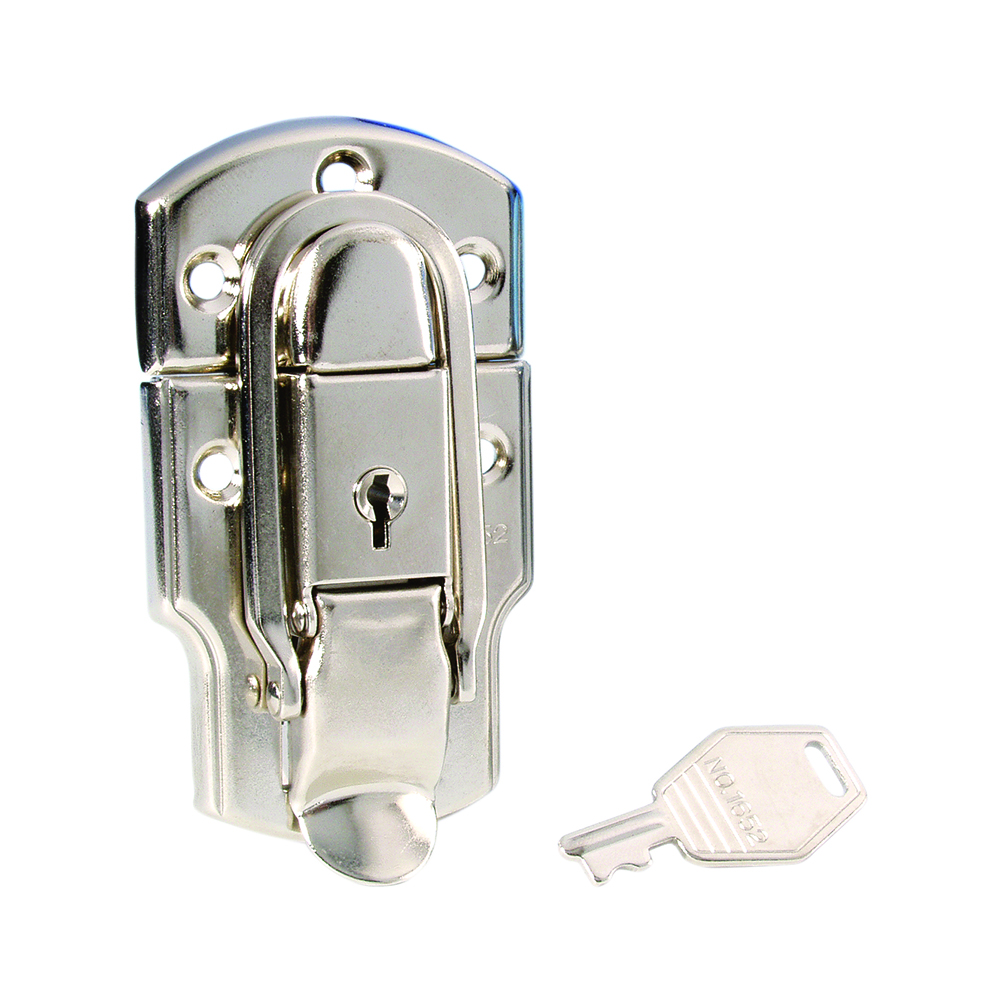 Zamek przykręcany, duży, niklowany, zamykany na klucz